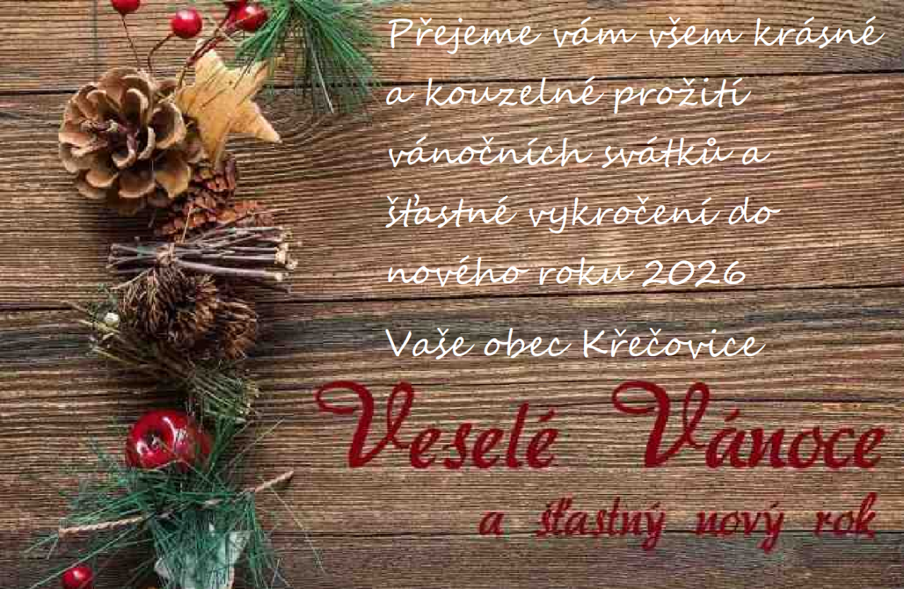 Jménem zaměstnanců a zastupitelů obce Křečovice, vám všem přejeme krásné, klidné a šťastné Vánoce a do nového roku spokojenost, pevné zdraví a mnoho úspěchů!